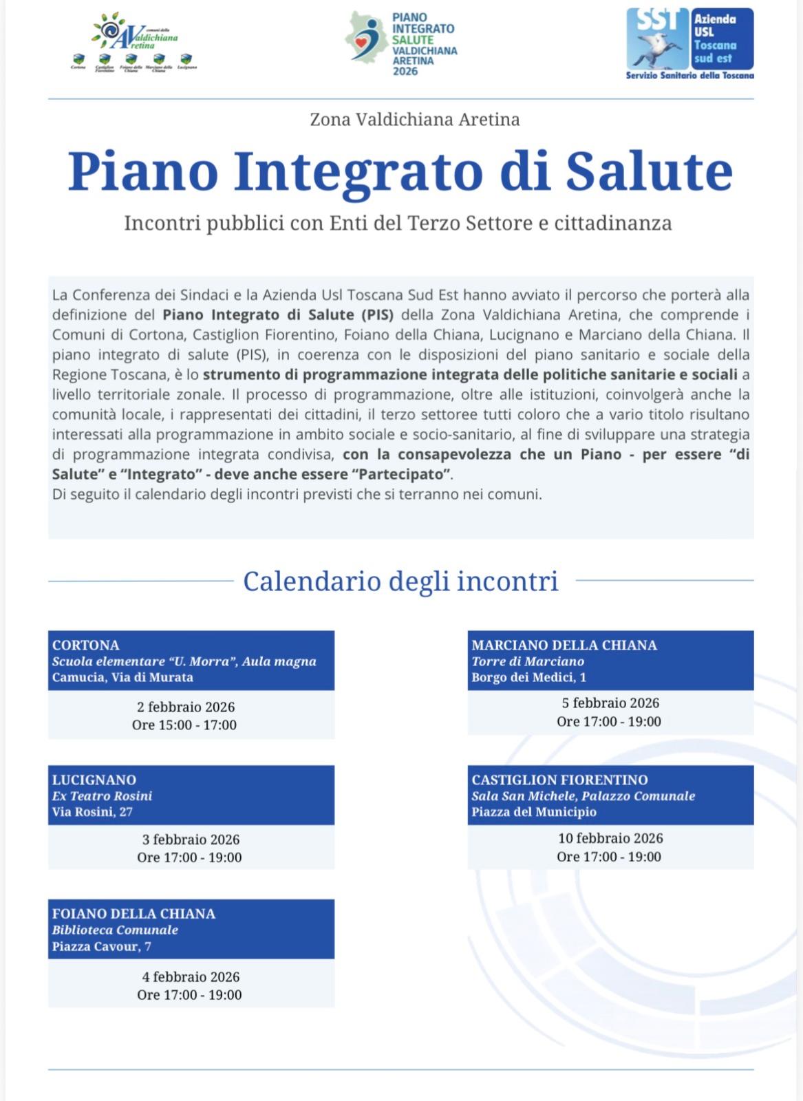 La Conferenza dei Sindaci e l’Azienda USL Toscana Sud Est hanno avviato il percorso di definizione del Piano Integrato di Salute, che interessa i Comuni di Cortona, Castiglion Fiorentino, Foiano della Chiana, Lucignano e Marciano della Chiana.